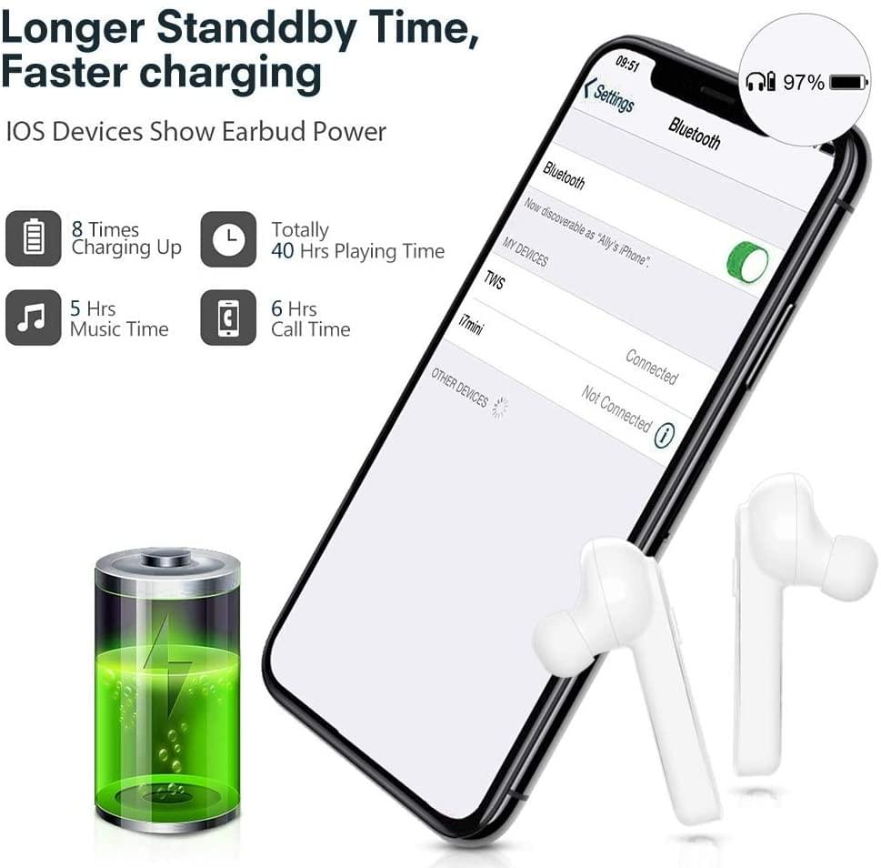 - ♬ [WORRY-FREE BATTERY] Bluetooth ear buds work 5 hours continuously for music or talking after once charged, and the charging case provides 8 time extra power if fully charged, so the earbuds power can last up to 40 hours. 360 hours of ultra long standby time. Once you put them into the case, they will charge automatically anywhere anytime, never worry about power when you go out